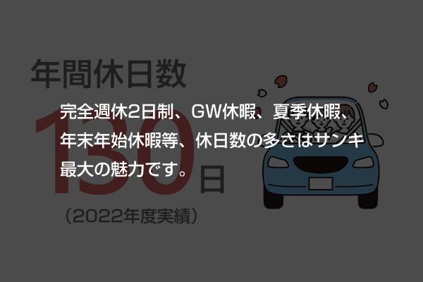 HOME | 採用 | 数字で見るサンキ [ サンキってこんな会社 ] 1946年、高松市に有限会社讃機(さんき)商会として設立後、70年以上の歴史を歩んできました。今後も時代や社会の変化に適切に対応し、さらなる発展を目指します。 着実にお客様からの信頼を積み重ね、成長し続けています。サンキグループ全体で連携し、お客様の課題解決に柔軟に対応します。 [ 働きやすさが自慢です ] サンキは社員一人一人のワークライフバランスを尊重します。有給休暇が取得しやすく、休日や祝日と組み合わせて連続休暇が実現可能。初年度は、入社日から6ヶ月後に10日間付与されます。 小学校就学前のお子さまがいる場合、育児短時間勤務を取得することが可能です。男性女性ともに、安心して子育てと仕事が両立できるよう全面サポートします。 完全週休2日制、GW休暇、夏季休暇、年末年始休暇等、休日数の多さはサンキ最大の魅力です。 サンキは社員のワークライフバランスを重視し、健康的で持続可能な労働環境を提供することを目指しています。家庭や趣味の時間など、プライベートを充実させることも大切だと考えます。 [ サンキで働く人たち ] 本社は香川県高松市。その他にも拠点が全国にあります。パート社員やグループ会社を含めると、全体では120名を超える従業員が、日々お客様と地域のために活躍しています。 経験豊富な先輩社員がしっかりサポートします。スキルアップ研修など新人から経営層まで全員に学びの場を提供している他、キャリアアップのための資格取得や通信教育受講を支援しています。 近年、女性を積極的に採用。多様な人材がお互いの能力を認め合い、生き生きと働ける職場づくりに力を入れています。女性社員比率・女性管理職比率30%が目標です。 社員や家族の健康と生活を向上させ、長く働き続けられる会社を目指します。働きやすい職場環境・制度づくりに積極的に取り組んでいます。 新卒採用、中途採用ともに積極的に行っています。フレッシュな社員と多様な経験を積んだ社員の両方がサンキを引っぱっています。 2022年度から外国人採用をスタート。それぞれの得意分野を活かして各部署で活躍中です。多様な人材が能力を最大限発揮できるようしっかりサポートします。